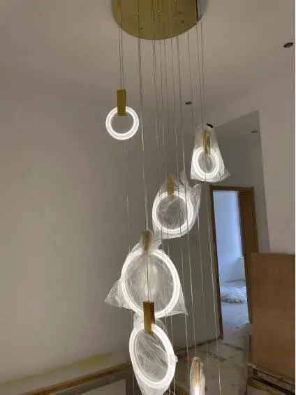 The Modern LED Ring Chandelier is a stunning lighting fixture that combines wood and acrylic materials to create a contemporary and elegant design. With its LED chip light source, it provides bright and energy-efficient illumination, perfect for various spaces such as stairs, living rooms, and dining rooms.